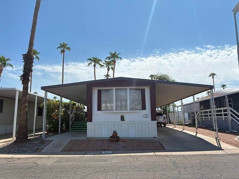 This spacious 2-bedroom, 1-bath Schult manufactured home (980 sq. ft.) is move-in ready and packed with features! Enjoy a huge patio deck perfect for relaxing or entertaining, plus a long carport with room for multiple vehicles. Inside, you'll find comfortable living spaces, central A/C, and all the essentials to make this house feel like home. Of you need storage this home has a ton of storage for all of your extras!Located in the popular Citrus Gardens 55+ Community in Mesa, AZ, you'll be close to shopping, dining, and just 20 minutes from Sky Harbor Airport. The community offers a friendly atmosphere with activities and amenities to enjoy year-round.Don't miss this one - affordable, spacious, and in a prime location!