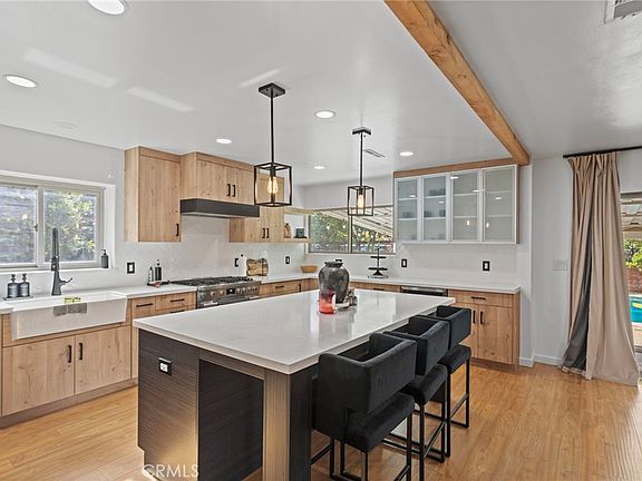 Sparkling poolBeautifully updated single-story homeMature landscapingTree-lined streetsModern designCustom cabinetryStylish pendant lighting