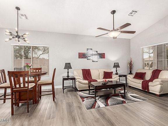 PRISTINE CONDITION & GENTLY ENJOYED CORNER LOT with NO IMMEDIATE NEIGHBORS BEHIND!!! This beautifully updated home is just waiting for a new owner! There is warm wood look LVP flooring in all the right places, a nicely sized Primary Suite featuring vaulted ceilings with ceiling fan, bathroom vanity with 2 sinks and a large walk-in closet. The kitchen has slab granite countertops and opens to the spacious family room with entertainment niche. Enjoy the low maintenance backyard from under the covered patio or choose to step out in south facing sunshine! Either way, this home will make the perfect full time or vacation home for years to come as it is all just a stones throw from the fabulous Anthem Community Center and the multitude of Anthem shopping and dining choices as well!
