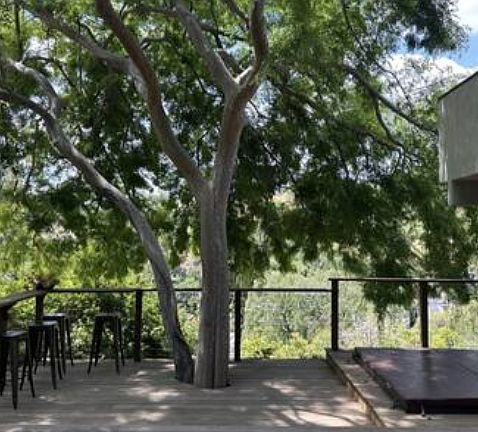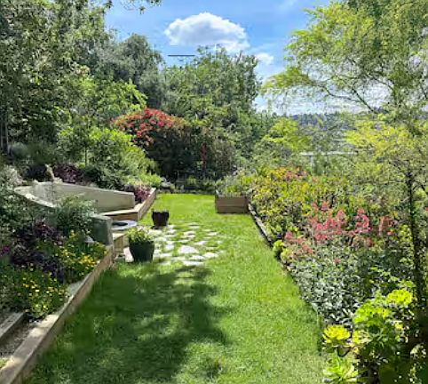 The outside is private with an abundance of trees and plants; a gardeners' paradise. Trees: plum, lemon, fig, lime, peach, apple, grapefruit, pomegranate, orange and avocado. Herbs: thyme, oregano, chives, onions, mint). The outside balconies, stonework, multi-level gardens, and landscaping make this estate so magical and remarkable. This property is appropriate for babies (non walking/crawling) and children over the age of 5. There are a lot of steps, so not appropriate for young walkers without adult assistance and supervision.