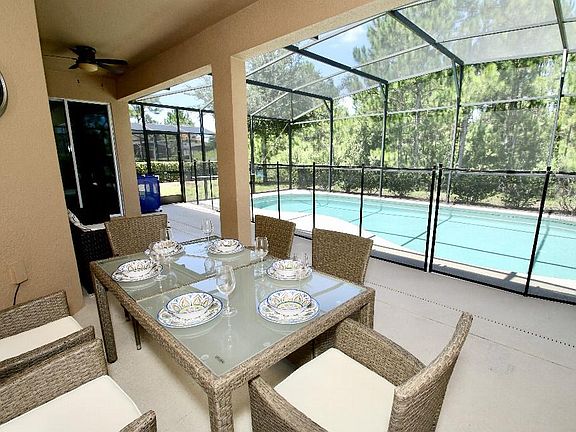Beautifully maintained, 5-bedroom, 4-bath single-story pool home on one of Solterra Resort’s premium conservation lots. Rarely available one-level design with 12 ft ceilings, 8 ft doors, and tile flooring throughout—single story homes are hard to find and highly desired for accessibility, convenience, and multi-generational living. Inside, the bright open layout includes two king master suites (one with pool access), a queen suite, and two twin bedrooms, plus three inviting social spaces: a large great room, a cozy retreat room, and an air-conditioned game room. The kitchen features granite counters, stainless steel appliances, and breakfast bar seating. Outside, enjoy a west-facing 30×15 heated pool and a spacious 30×40 screened lanai with multiple seating and dining areas overlooking peaceful conservation with no rear neighbors. Solterra Resort offers a clubhouse, fitness center, café, tennis, lazy river, water slide, playground, and 24-hour manned gate. Ideal for full-time living or short-term rental.