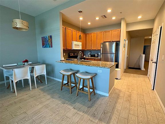 Welcome to your beautiful home and relaxing haven! This prime location offers easy access to fun and sun! This is a beautifully appointed second-floor Berkeley model condominium located in the highly sought-after Palma Sola Trace Community of Bradenton, Florida. This move-in ready 2-bedroom, 2-bath residence offers 1,228 square feet of stylish and functional living space. Palma Sola Trace is an immaculately maintained, mixed residential community. Enter through your private one-car garage into a tiled foyer and head upstairs to the spacious open-concept layout featuring high ceilings, ceiling fans, and wood-look tile flooring. The kitchen is a standout with granite countertops, 42" maple cabinetry, a deep sink, and a breakfast bar that opens to the living and dining areas. Just off the kitchen, you’ll find a stackable washer and dryer for added convenience. The living area extends to a screened lanai with stylish sliding louvre doors, perfect for enjoying your morning coffee or evening breeze while overlooking the lush greenbelt. The spacious primary suite includes a walk-in closet and ensuite bath with a glass-enclosed shower, granite topped vanity, and natural light from the high window. The second bedroom, shares a Jack-and-Jill style bathroom with a tub/shower combo, glass sliding doors and granite topped vanity. Residents enjoy access to resort-style amenities including a lagoon-style heated pool, a well-equipped fitness center, a clubhouse with a catering kitchen and lounge areas, and a playground. The HOA fee covers exterior maintenance, cable, internet, pest control, and more! Palma Sola Trace is a pet-friendly community with no size restrictions. The lush and well maintained greenery lends to pleasant walks. Conveniently located less than five miles from the beaches of Anna Maria Island where sun, fun and endless water activities abound! Shops and restaurants aplenty including a walkable shopping plaza with FirstWatch, HomeGoods, Winn Dixie and more! You are a quick drive to the vibrant downtown of Sarasota! In addition, a new City Center with Publix, eateries and retail is planned for the end of 2026! This location offers the best of Florida living! Whether you're looking for a full-time home, seasonal retreat, or investment opportunity, 4067 Overture Circle delivers comfort, convenience, and a vibrant coastal lifestyle. Schedule your tour today!