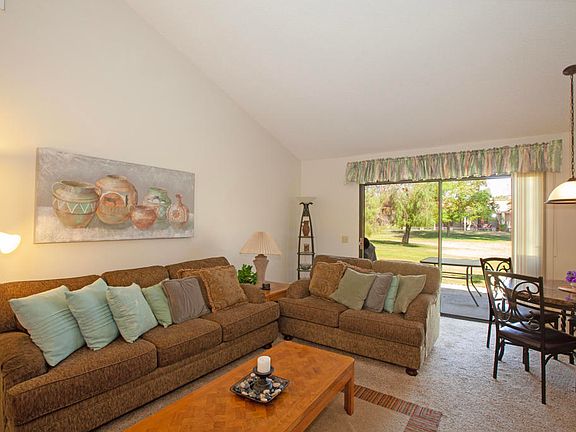This is a wonderful 2 bedroom, 1 bath condo. The kitchen was remodeled in 2016-17 with granite counters and new cabinets, tile, fixtures, range and microwave. The bathroom was also remodeled in 2016-17. It is being sold turnkey furnished, just bring your clothes, swimsuits, clubs and rackets and enjoy The Resorter!! The stacked washer and dryer are included and are in the closet off the carport. You're on a greenbelt area and there are numerous community swimming pools and spas. There's golf, a beautiful clubhouse, tennis and pickleball courts. (Additional fees for golf, tennis and pickleball.) It's a fabulous community. Come take a look at this cute condo!