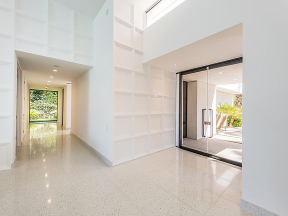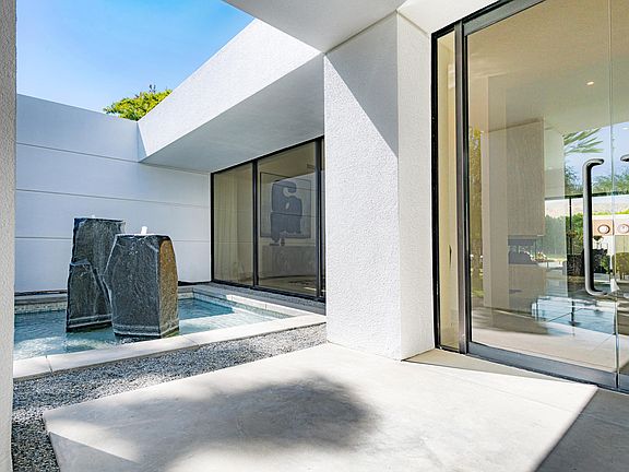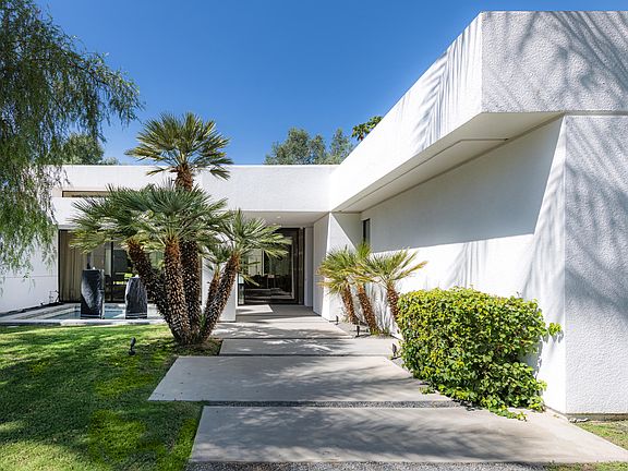 Located in the prestigious Mission Ranch enclave on Clancy Lane this beautifully updated and remodeled home by Scott Cullens and Palm Pacific Construction and interior design by architect Jill Lewis who teamed up to win the Luxe Magazine Peoples Choice Award, will be a treasured destination for years to come. No detail has been overlooked on this 6,000 plus square foot home. Enter thru the glass front doors your eyes are drawn to the 14 foot high marble fireplace and the retractable wall of glass beyond. The open main living area of this home boasts terrazzo tile floors thru out, a sexy sunken cocktail bar beautifully situated with its own lounge area and an impressive living room with views of the pool, spa and mountains beyond. The modern kitchen with its new high end Thermador stainless appliances, terrazzo backsplash and waterfall island are open to all of the entertaining areas of the main room. Entering the master suite and you are greeted by warm wood tones from the custom modern paneling and views of the pool. The private master bath features a large glassed in shower and also has access to the out door shower. The two large guest suites also have private baths. Outside the brand new white tiled pool and spa offer a respite while the cabana is the perfect spot to hang out, and entertain.This one of a kind property has everything Mission Ranch offers including guard gate, tennis courts, equestrian riding and a beautiful park like setting.
