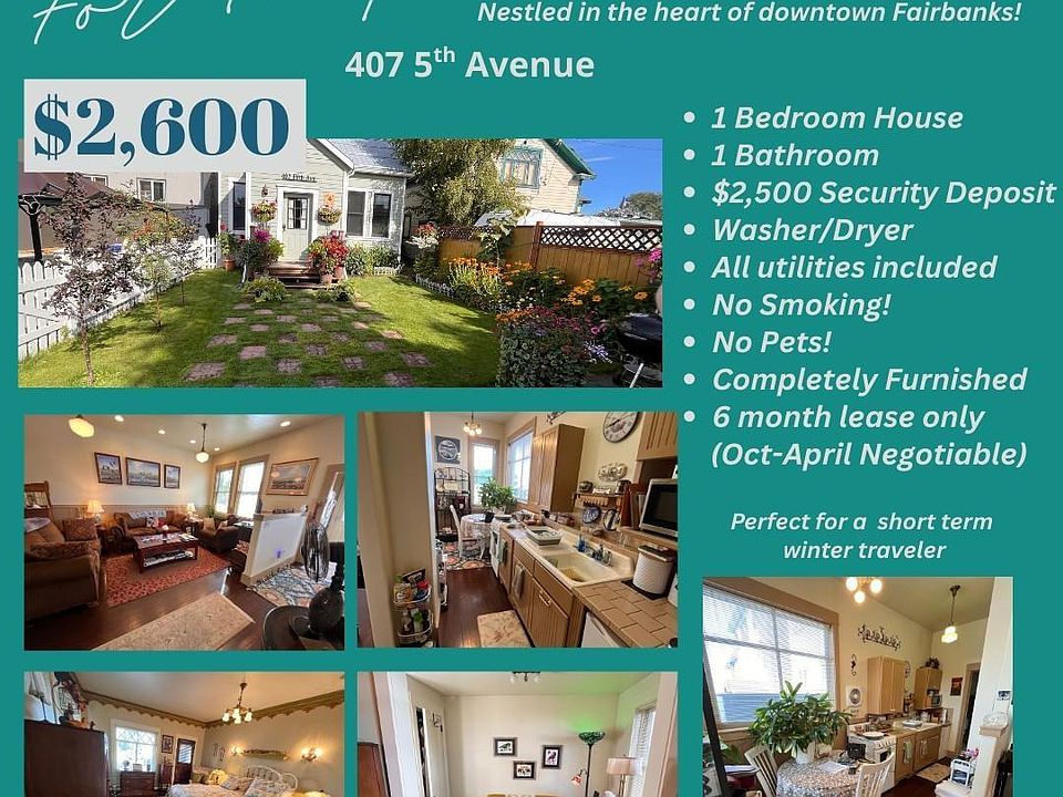 Step into this charming, historic cottage nestled in the heart of downtown Fairbanks. Large 1 bedroom with sitting room attached. Open living concept with bathroom off the kitchen. Lots of windows and small decks attached to both front and back doors. Washer and dryer in home! Beautifully furnished throughout with antiques, this unique cottage offers comfort, character, and convenience. All utilities included-(heat, water, internet and electricity). Haul your own garbage. Looking for a responsible tenant to care of this home over the winter months, beginning October 1st, 2025, through March 31st, 2025. 6 Month lease only! No smoking & No pets! No exceptions! Now accepting applications, $40 application fee once accepted. Income verification required, with rental references! Along with tenant background check prior to acceptance.