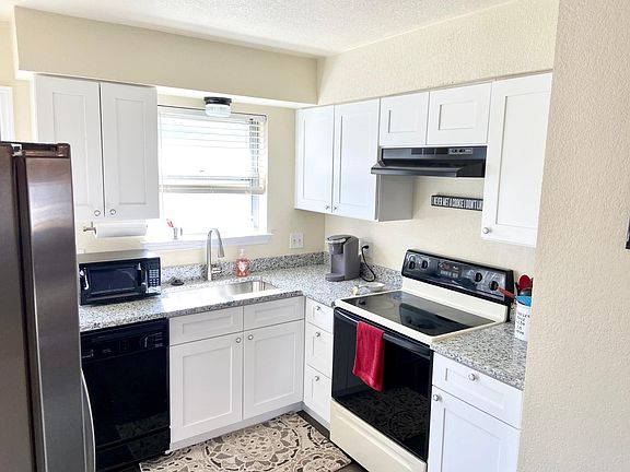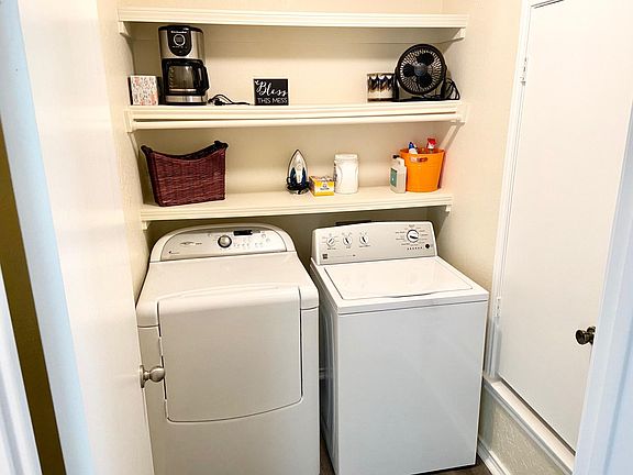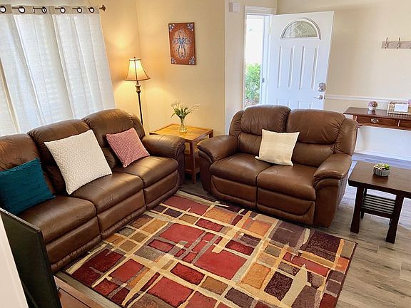 Each bedroom has a dresser, ceiling fan, and a plush Queen bed. The kitchen is fully equipped for any cooking you may want to do with updated appliances. The backyard has a small patio with comfortable table and chairs.
