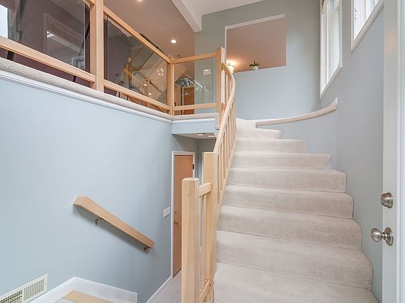 Move right into this Lovely, bright & open 4 level townhouse w/2 car gar in beautiful private location! Step into the dbl glass door entry to a soaring 2 story foyer w/loads of windows bringing the outdoors in! Bright living rm w/new top of the line, nylon carpet, Gas fireplace & recessed Lts! Huge kit/dining rm combination w/tiled flr, recessed Lts & French dr to Lg private deck! 2nd level has Lg Master suite w/cathedral ceiling, ceiling fan, recessed Lts, sitting area w/walls of windows, new nylon carpet & gas fireplace that opens to luxurious bathrm w/jacuzzi tub, separate shower, cathedral ceiling & recessed Lts! 2nd bedrm w/cathedral ceiling, ceiling fan, new nylon carpet & private full bth! 3rd level loft w/recessed Lts, great for home office! Family rm /bonus rm in lovely walk out lower w/laundry, Lg closet & slider out to private yard! 2 car tandem garage! See list of updates! Wonderful complex, close to everything! One of the best locations w/views of woods from most windows!
