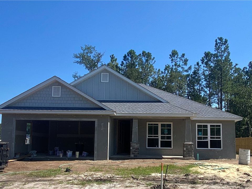 This is a beautiful 4 bedroom, 2 1/2 bathroom stucco home with cement siding in the gables and stone column bases at the front porch. There are 30 year architectural shingles. The ceiling in the main bedroom is a 10' step ceiling with 9' ceilings throughout the remainder of this home. This home includes a double garage with opener and 2 remotes. There will be gutters at the front porch. There are custom recessed panel painted cabinets in the kitchen, bathrooms, and laundry room with under-cabinet lighting in the kitchen. The kitchen and bathrooms feature solid surface countertops. The main bathroom is complete with a garden tub, separate shower with glass enclosure, double vanity, and a walk-in closet. Ceiling fans will be included in the great room, bedrooms, and on the back porch. There is a community irrigation water system. The cost of water for irrigation is $27.50 for up to 10,000 gallons per month with an additional charge for each additional 1, 000 gallons. Crown molding will be installed in the foyer, kitchen, dining room, great room, and main bedroom. The garage door trim and garage lamps will be carriage style.