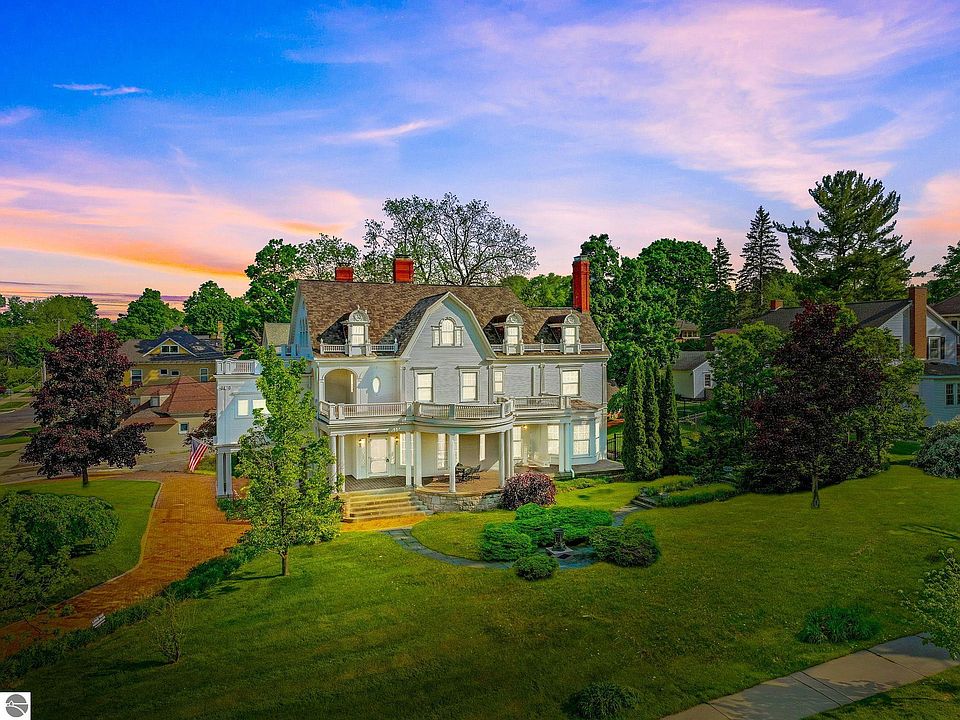 Iconic Cadillac Estate! This one-of-a-kind historic Dutch Neo-Classical residence was built in 1897 by lumber baron Frank J. Cobbs. Believed to be a Colonial Revival design by acclaimed architect George Mason—renowned for the Grand Hotel on Mackinac Island and the Cobbs & Mitchell Building in Cadillac—this architectural treasure has been lovingly and authentically maintained by the same family for over 30 years. The home’s historical and architectural significance even earned it a feature in The New York Times. Crafted with some of the finest materials available to Cobbs, the interior features African mahogany, quarter-sawn oak, rift-sawn oak, birds-eye maple, and other specialty hardwoods. Six individually designed fireplaces serve as showpieces throughout the home, each constructed using period materials such as Grueby tiles, bronze, marble, and carved wood. Period lighting fixtures further enhance the warm, inviting atmosphere and respect the home's 19th-century origins.The home offers three ensuite bedrooms, a third-floor penthouse apartment, and a separate studio apartment in the basement. The updated kitchen features granite counters, William Ohs cabinetry, and premium appliances, with a butler’s pantry for added storage. The formal dining room is wrapped in rich Jacquard tapestry—carefully reproduced on the original European loom to perfectly match the historic fabric, offering a regal setting for entertaining. Set on three lots with a circular drive, brick parking area, mature gardens, and a covered porch, the home combines grandeur with comfort. Additional highlights include two new high-efficiency boilers, a fenced dog run, and a three-car garage. Ideally located within walking distance to downtown shops, restaurants, and Lake Cadillac, and just a short drive to Traverse City or Wexford County Airport.