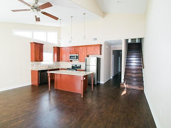 Wood floorsWooden stairsStainless steel appliancesQuartz countertopsVaulted ceilingsLarge open living spaceParking in the front
