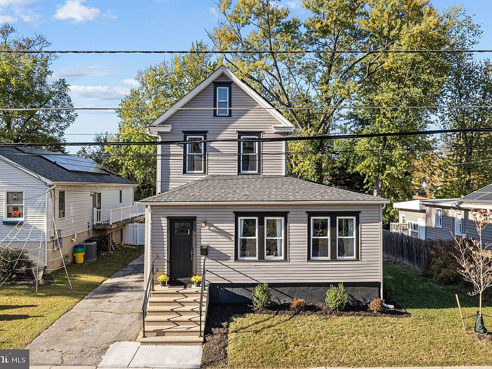Completely reimagined in 2024, this Barrington gem blends modern design with everyday comfort. Step inside to a bright, cheerful and open layout where the living and dining areas flow effortlessly into a stunning custom kitchen featuring stainless steel appliances, sleek quartz countertops, soft-close cabinetry, and a breakfast bar perfect for casual meals or morning coffee. Plank flooring stretches across the first floor, including a convenient mud room and a utility room with window perfect for pets. A spacious first-floor primary suite with a beautifully tiled full bath finish off the main floor. Upstairs, three additional bedrooms share another custom-tiled bath, each room offering generous space and natural light, and walk up to 3rd floor attic storage. The home also includes a partial unfinished cellar—for storage/utilities. Outside, enjoy a brand-new rear deck overlooking a wide, grassy yard—great for hosting gatherings, grilling, or relaxing in the sunshine. A private driveway provides easy off-street parking and freshly landscaped. Major updates include a new roof and solar panel system (installed 2024) for energy efficiency and peace of mind. Location highlights abound: Wish Upon A Star Park & Softball Fields, The Rail, Berri Caffeinated, Tonewood Brewery and more. The lively Barrington downtown area offers local dining, coffee, and craft beer spots, all within an easy walk. Commuters will appreciate nearby access to White Horse Pike (NJ-30), I-295, and PATCO transit. Stylishly updated, move-in ready, and ideally located near everything downtown Barrington has to offer—407 Kingston Ave truly delivers modern comfort and neighborhood charm in one package.