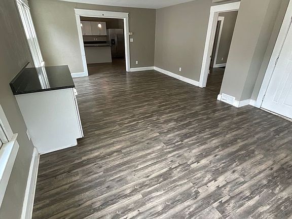 Huge back deckStainless steel kitchen appliancesKitchen cabinetsGranite islandHard flooring