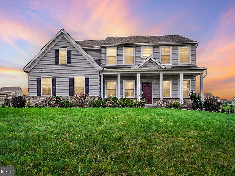 Welcome to this spacious and beautifully appointed 4-bedroom, 2.5-bath Colonial located in the desirable sidewalk community of Hamilton's Overlook. Situated on a generous and level .60-acre lot, this home offers over 3,100 square feet of finished living space and is thoughtfully designed for modern living. Step inside to find luxury vinyl flooring throughout the main level, a stylish drop zone area off the mud room and a well-equipped kitchen featuring quartz countertops, a prep island with pendant lighting, desirable gas cooking, and a full walk-in pantry. The formal dining room and first-floor office add flexibility for both entertaining and working from home. A cozy gas fireplace anchors the inviting family room. Upstairs, the expansive primary suite boasts a trey ceiling, dual walk-in closets, and a luxurious Roman-style bath complete with soaking tub, separate tile shower, and double vanities. Three additional bedrooms offer ample space for family or guests. No lugging laundry upstairs, convenience-focused laundry room is well placed at the end of the hall. The partially finished basement includes a rec room and is already roughed in for a future full bath—offering endless potential for customization. Enjoy outdoor living on the large, low-maintenance composite deck—perfect for relaxing or entertaining—overlooking the expansive, level backyard. The oversized side-entry two-car garage includes a convenient storage area perfect for lawn equipment, bikes, or outdoor toys. The home is Ideally located just minutes from I-83 for an easy commute, this home is also close to the Heritage Rail Trail—perfect for walking, running, or biking. Enjoy quick access to downtown York’s vibrant nightlife, local breweries, entertainment, and a wide selection of eateries. Don't miss your chance to own this move-in-ready home combining comfort, style, and space both inside and out.
