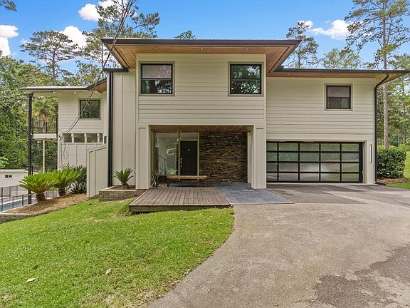 Elevated living with a modern contemporary aesthetic in Plantation Heights! Recently renovated in 2019, this unique luxury home offers 4 bedrooms, a new 2023 metal roof, elevator, hardwood flooring, granite countertops, new fixtures, walk-in closets, and large windows with lush views. The second level offers living room with soaring vaulted ceiling and balcony that overlooks pool and backyard, eat-in kitchen with island and bartop seating, 3 bedrooms and 2 bathrooms. Additional bedroom and full bath downstairs would also be a great office or hobby room. The private 2.2 acre lot with redesigned pool area make this home an in-town oasis! Climate controlled 2-car garage with workshop. Convenient and desirable in-town location!