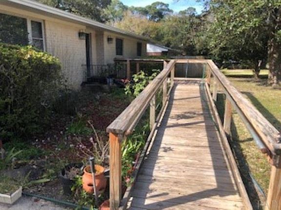 Lovely 3Bdrm/3Bth Home on a quiet cul-de-sac street on a large lot that is a gardener's dream. This home is wheelchair accessible with an entrance ramp already in place, chair width doors and hallways, and the master shower is tiled and built for wheelchair entrance. The new Architectural Roof is about 3 years old. Inside, you'll find 2 large living rooms (one is a den) and 3 large bedrooms, 2 baths and the 3rd full bath is located in the garage, which has easy access to the backyard via an entrance door from the back making it the perfect yard work/pool bath should you ever desire. The back yard has plenty of space for a pool addition. Also, for the hobby/yard enthusiast, out back there is a 12 x 40 workshop with power, mature fruit and shade trees, and is fully fenced. All that, along with a well and sprinkler system. Priced to sell leaving money for your choices in renovating. Perfect location close to the water at Navy Point, and convenient to just about everything you will need; Navy Base, Navy Hospital, Beaches, Shopping, PSC, Downtown, Pensacola Blue Wahoos Stadium , and close to 110 for easy commute to just about anything else. Come home to this peaceful location!