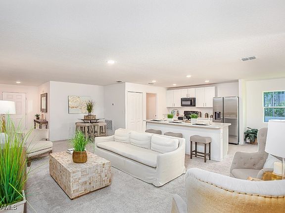 Additional highlights include ceramic tile flooring throughout the main living areas and carpet in the bedrooms, as well as impact windows for peace of mind and energy efficiency. A walk-through laundry room connects conveniently to the 2-car garage, maximizing function and flow.