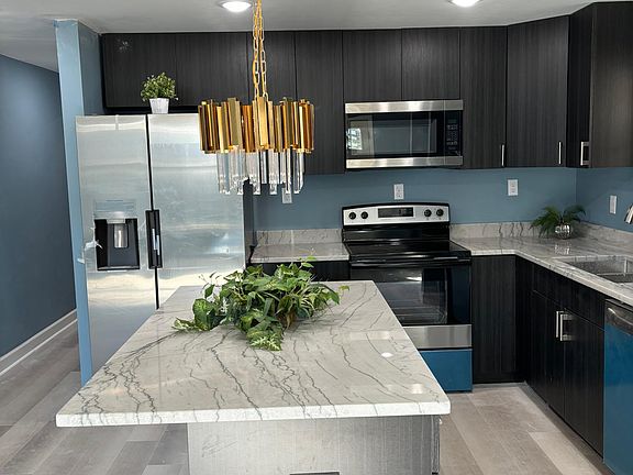 Open-concept kitchen with quartzite countertops & stainless steel appliances