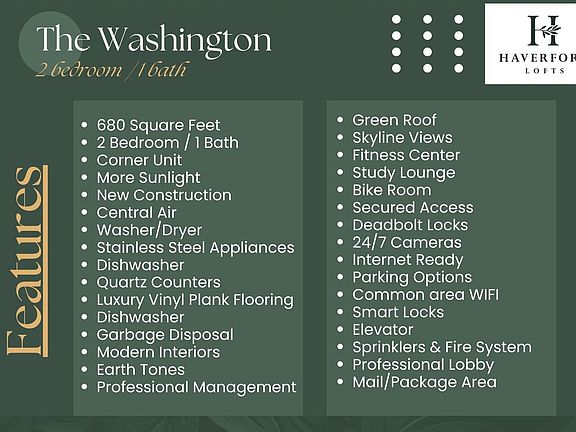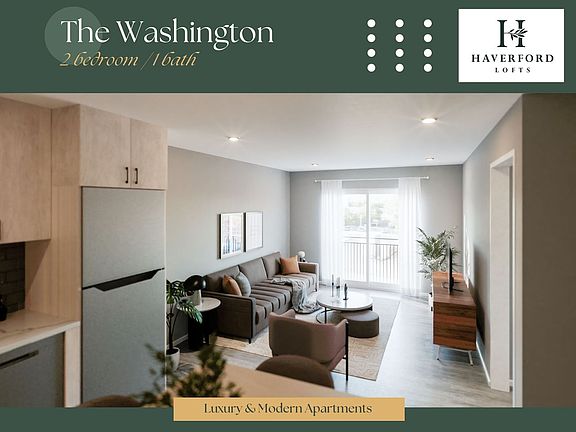 The Washington is a Luxurious 2 Bedroom / 1 Bathroom apartment that has a separated Den space, a perfect home office location! Enjoy your new kitchen with Quartz counters, new stainless steel appliances, and spacious cabinets! Designed with tons of natural light with modern, earth-tone elements. The Jackson offers walk-in closets, breakfast bars, in unit Washer/Dryer! We cater to graduate-level professionals, fellows, residents, staff, researchers, etc. Haverford Lofts also offers a professional lobby with mailroom and package area, fitness center, study lounge, indoor bike parking, and roof deck with city views. You'll love living here with close proximity to campus and the hospitals.