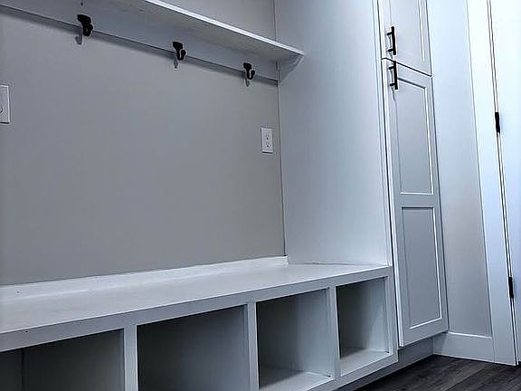 ? Custom built mudroom bench with shoe storage and backpack hangers — ideal for keeping the entry organized