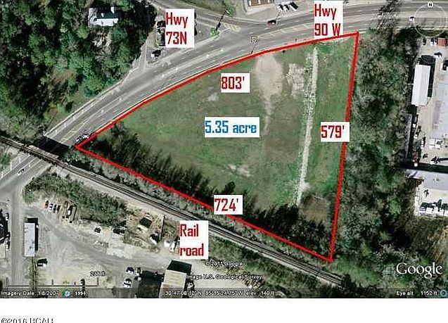 Great commercial location in MARIANNA FLORIDA, Some of NW Florida Panhandle's finest. Sitting At the intersection of Hwy 73N & Hwy 90, 5.35 Acres.Level, public water and sewage, 803 front foot on Hwy 90, 724 ft on railroad. Great location for shopping center, grocery store, warehousing, ect. DOT traffic count for the intersection is 14,900 cars a day!