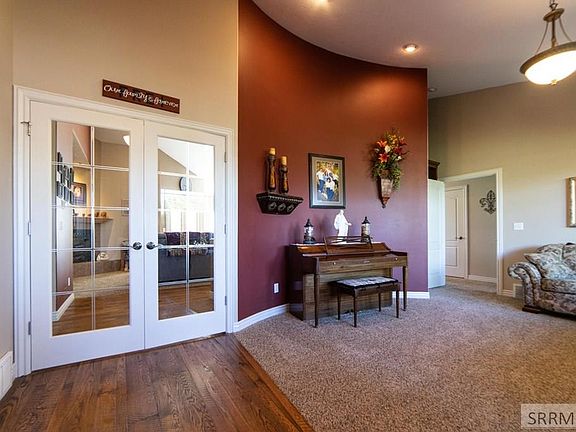 Spacious country home on 5.7 acres just one mile north of Freeman Park and INL. This beautiful home was thoughtfully designed as a gathering place with a flowing, open floor plan and a lot of natural light. Off the main entry is a private office with a built-in bookcase and separate outside entrance. The large formal living room is bright with beautiful french doors separating it from a spacious family room and gourmet kitchen. The dining room overlooks a large covered deck and a luscious, tree-lined, green pasture. The enormous master suite features a cozy gas fireplace, walk-in closet, toilet room, jetted tub, and large walk-in shower. The main level also contains a gas fireplace, guest bedroom, 1 1/2 baths, laundry, lockers, and pantry. The unique curved staircase leads to a beautiful daylight basement with huge family/game room, gas fireplace, gym, two storage rooms, kitchen, three large bedrooms, two full baths, utility room and laundry. French doors lead to an additional covered deck and large sloping lawn. This handicap accessible home has an oversized 3 car garage and beautifully landscaped yard. The property also features a large circular driveway, orchard, large shop, sheds and corral. Come enjoy this one-of-a-kind property while it lasts!