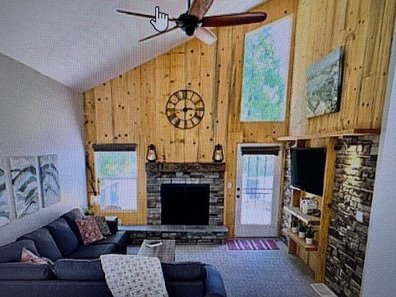 This charming house offers a very open floor plan, perfect for gatherings and relaxation. You'll be greeted by vaulted knotty pine ceilings and an abundance of natural light streaming through floor-to-ceiling windows, creating a warm and inviting atmosphere.