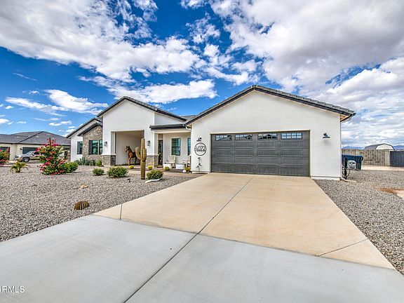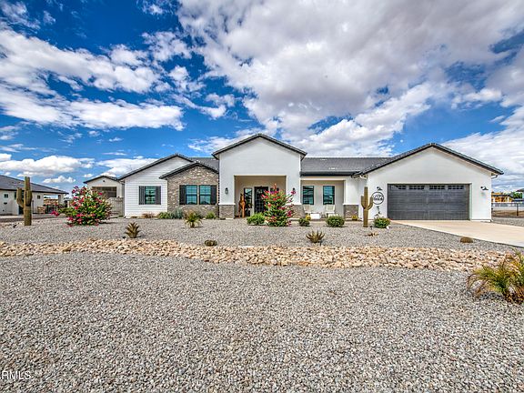 STUNNING 5 bedroom, 4.5 bath home on a 1.25 acre flood irrigated parcel on PAVED road. The front patio leads you into a fabulous great room with fireplace and huge doors to the outside. The gourmet kitchen is full of fabulous features: cabinets to the ceiling, double ovens and cooktop, island, quartz countertops, fridge & freezer, pot filler. The primary suite has his and hers closets. 4 other bedrooms with walk-in closets and attached baths. Off the foyer/great room is a guest bath and a den with barn door. The laundry room can be entered from either side and has barn doors on each side. The covered patio is made for entertaining and relaxing. Oversized 4 car garage has overhead storage. RV gate to backyard. Container is outfitted as a grain and tack room. Horse stalls and round pen.