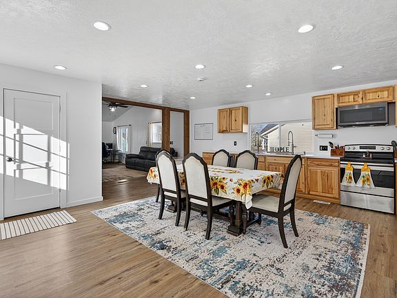 Updated rambler with a full mother-in-law apartment, oversized detached garage, and major system upgrades! This 5 bed, 3 bath home features a grand living room, updated kitchen and flooring (2023), and newer essentials throughout-roof (2022), water heater (2023), furnace & A/C (2024), windows with warranty (2024), and attic insulation (2024). The basement includes a complete MIL apartment with its own entrance and kitchen, plus an additional framed 3/4 bath ready to finish. Detached 26' x 36' garage offers an insulated 18' x 10' door, water line, and abundant workspace. This can be a shop or storage for your toys and truck. Backyard includes a pergola, powered 20' x 10' shed, and electrical hookups on the fence. Sprinkler system installed. Income potential and possible opportunity to purchase land behind the property. Prime Eagle Mountain location! Come see it today.
