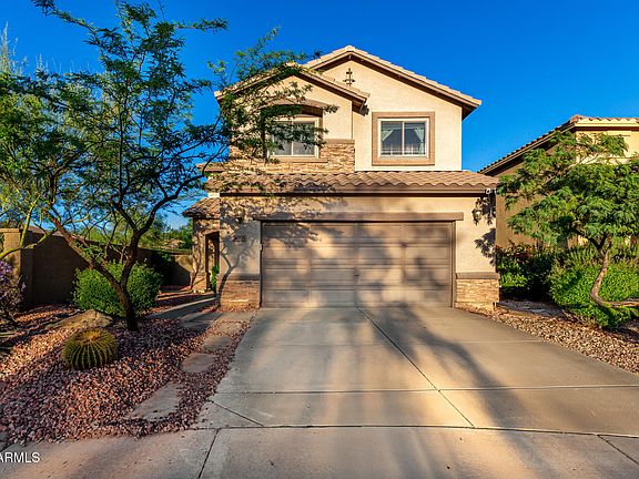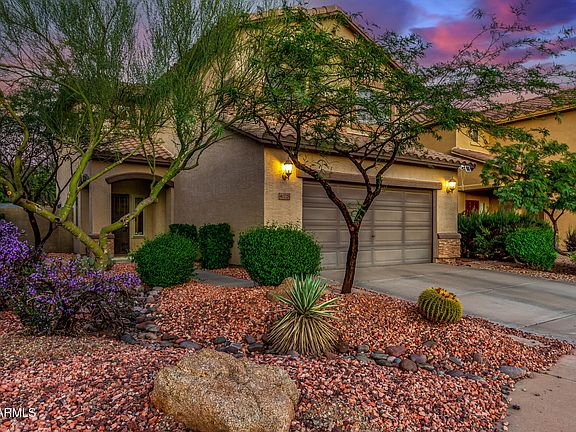 Enjoy this beautiful 5-bedroom home situated on a PRIME cul-de-sac! Discover an inviting living room with soaring vaulted ceilings and a desirable great room, thoughtfully designed to maximize the space for airy and easy access to everyday living. Spotless kitchen offers plenty of upgraded white cabinetry, stainless steel appliances, tile backsplash, recessed lighting, granite counters, and a lengthened center island. Enter through the double doors to find an impeccable primary retreat, complete with a walk-in closet for effortless organization and a private ensuite with dual sinks for added comfort. The secondary bedrooms include well-sized closets for convenience. Tranquility awaits in the spacious backyard, which provides a covered patio, storage shed, and mature shade trees and turf. Features: prime cul de sac scenic/private/premium lot w/ concrete trailhead in the cul de sac. Trail leads to Anthem waterpark and community center. New water heater, new garage opener, new dishwasher and microwave, newer upgraded windows, entire inside professionally painted, nice shed added, nice artificial turf in the backyard and so much more. Home has been exceptionally cared for and maintained and awaits its new owner.
