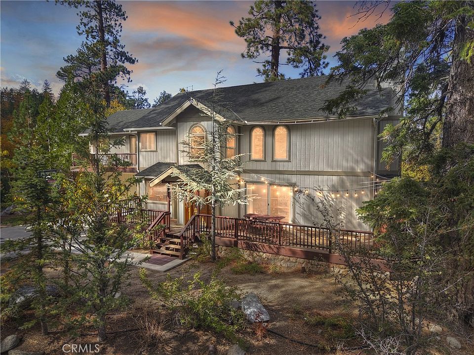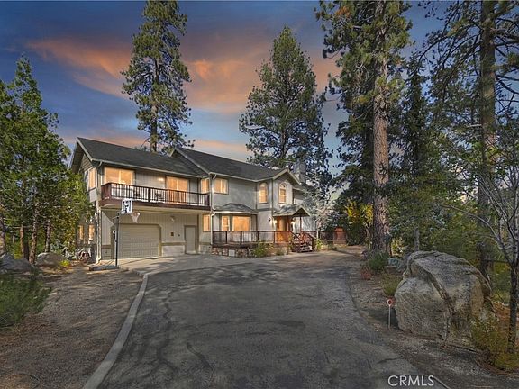 Up the San Bernardino Mountains you will find a charming town called Big Bear ~ Though small for its size, this town boasts a large lake, The Village and two resorts for skiing, snowboarding, hiking, mountain biking and all manner of recreation ~ Perched above the Village, while still within walking distance to it, you encounter this wonderful home ~ On 40,000 sq. ft., just shy of a full acre, is this 5 bedroom, 2.5 bathroom escape ~ It also has a detached guest house with it's own bedroom and bathroom ~ As you pull up to the property you will immediately fall head over heels with the setting ~ The long flat driveway leads you deeper onto the property where you find your home sitting on top of the hill like a monarch upon their throne ~ Your well treed land gives you the ultimate illusion of seclusion, making you feel as though you are alone in the forest ~ The outdoors gives you plenty of areas to relax from your front deck, firepit or your own lookout ~ As you enter you will absolutely love the floor to ceiling, and wood burning, rock fireplace in the Great Room ~ This is the ideal area to spend quality time with your loved ones creating lifelong memories together ~ The kitchen is open to the Great Room and has the cutest dining area you could wish for ~ Also on the main floor you have the master bedroom with peek-a-boo lake views, the laundry room with 1/2 bathroom and interior access to the garage ~ Upstairs you will find a large bedroom, above the master, that also has lake views, along with 2 more bedrooms, a large family room that is currently being used as the 5th bedroom and the second bathroom ~ The second bathroom is it's own work of art ~ The detached guest house is the perfect little cottage to add to this home's allure ~ Across the street from the National Forest, walking distance to the Village, 5 minutes to the lake, 8 minutes to the ski slopes and room to gather all your loved ones together under one roof! What are you waiting for?