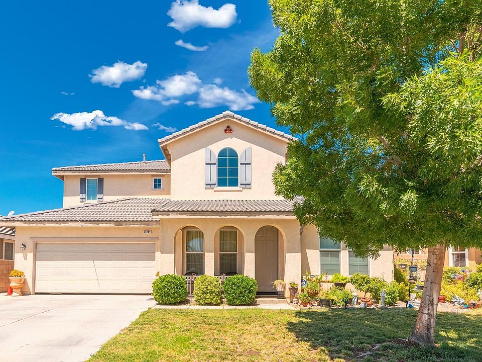 Welcome to this beautifully maintained home located on a quiet cul-de-sac, near the Rancho Vista Golf Course, one of the most sought after neighborhoods in the AV. The family chef will enjoy the huge kitchen with eat-in dining area, upgraded counter tops & backsplash, extra large center island, and an abundance of cabinets and pantry. The kitchen adjoins a spacious family room w/a cozy fireplace. This home features gorgeous wood flooring at the entry, formal living room w/high ceiling, & formal dining room. Downstairs also features one bedroom and full bath. Upstairs you will find a study area with built in desk, shelving and cabinets. The master bedroom is large with a walk-in closet. The master bath features a large soaking tub, walk-in shower & dual vanities. Two additional bedrooms & the laundry room are also located upstairs. Spend summer evenings relaxing on the full length rear patio. Perfect for entertaining. Home is conveniently located to markets, dining, & entertainment.