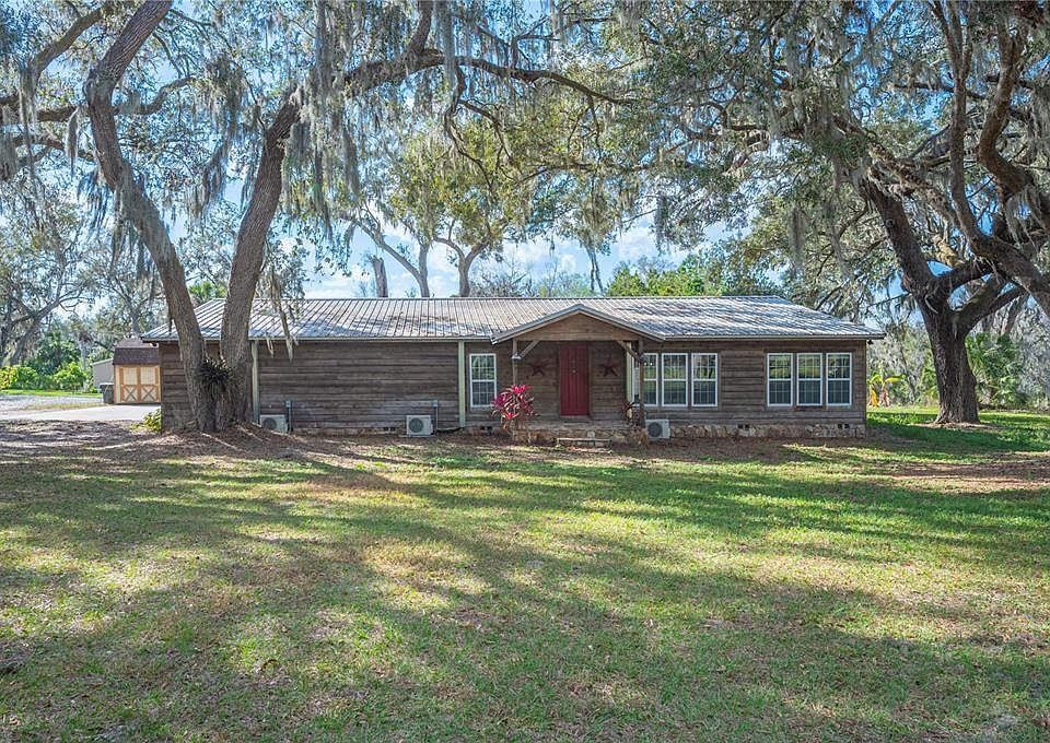 Looking for a cozy home with space to spread out? Look no further! This stunning 3-bedroom, 2-bathroom farmhouse-inspired home is situated on 1.16 acres, offering plenty of space and privacy. Step inside to find a gorgeous updated kitchen featuring butcher block countertops, a large kitchen island, gas stove, stainless steel appliances, and a charming brick backsplash, perfect for culinary enthusiasts & those who love to entertain. The cozy and large living area boasts a stunning wood-burning stone fireplace which is truly the statement piece of the entire home. Outside you have a large screened in patio with a wood burning oven perfect for cooking outside in the evenings. The beautiful Cedar siding adds a touch of rustic elegance, blending seamlessly with the natural surroundings. Enjoy NO HOA & plenty of space for your toys, pets & more! Other great features include a newer Metal roof, Hurricane impact windows, Luxury Vinyl Plank flooring throughout, & new tile in the hall bathroom. Don’t miss this opportunity to own a piece of paradise in Mulberry!