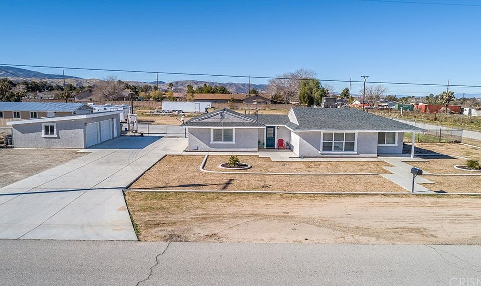 This updated farmhouse is perfect for that country living feel, in town! Beautifully remodeled, this West Palmdale home features hardwood flooring throughout the living areas and bedrooms. The kitchen has custom cabinets, granite counters, glass tile backsplash and oversized pantry, with adjacent dining area. The split floor plan has the master suite off the kitchen with dual closets and custom tile work in the attached bathroom. On the other side of the house are 2 additional bedrooms and another full bath. A laundry room with utility sink completed the inside. Outside, the nearly 2.5 acre lot features a detached 3-car garage, finished with AC and attached storage room. There is also a large workshop that is insulated, has separate electricity service, metal roof and swamp cooler. The rest of the completely fenced yard includes an invisible fence line for dogs, landscaped area in the backyard for kids/entertaining, and 3 large rolling gates for easy access. New HVAC and tankless water heater! See this one today!