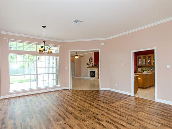 What a great opportunity to live in the desirable Vista Oaks community in this beautiful 1 story, 4 BR, 2 BA home. Open floor plan, crown molding, large windows, vinyl plank & tile flooring are just some of the special features. Wonderful gourmet kitchen with silestone counters, SS appliances, gas range w/double oven, center island, breakfast bar with pendant lighting, and pantry. Nice sized family room with fireplace. MIL plan with master having garden tub/walk-in shower, dual vanity & walk-in closet. 4th BR with doorway to 3rd bedroom could be nursery, home office, work out room, etc. 2nd bath updated with granite counter, lighting and tile surround at tub. New roof and exterior paint (3/2021) ... HUGE back yard with large trees and patio. Neighborhood amenities include community pool, park, playground, pavilion, sport courts, and more. Easy access to dining, shopping & major roadways.