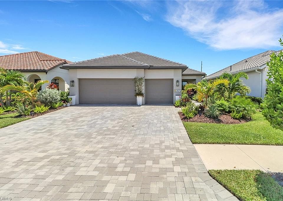 This home was built in 2023. Meadow Brook floorplan is simply the best. Can be sold with or with the furniture. Three bedrooms plus den and a 3 car garage!!! The kitchen has 42 "white shaker cabinets with pull outs, quartz countertops, a large island, stainless steel appliances & natural gas what a plus for cooking! Walk in pantry has a smoked glass door. Cool color accents are present throughout this lovely home. Porcelain tile in living areas and den, carpet in the bedrooms. Open living and dining area makes entertaining easy. Tray ceilings in the living area and master. The master has 2 walk in closets and a gorgeous bathroom gray & white upgraded tile and flooring. There is a walk in closet in the guest bedroom. A 3 car garage with epoxy flooring what is better than that!! Laundry room offers a sink and cabinets. A screened in Lanai with an enlarged patio, Southern views give plenty of light in this home and has a backyard for your pet to lounge around in. Lanai features Mont Alpi Grill and sink with granite countertops. Front and back of home are professionally landscaped. Last but not least Impact glass and an Impact front Door!! You will be busy with these amenities, a beautiful pool, lap pool, spa, fitness center, tennis courts, pickle ball courts, bocce, clubhouse and more!