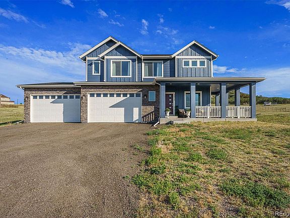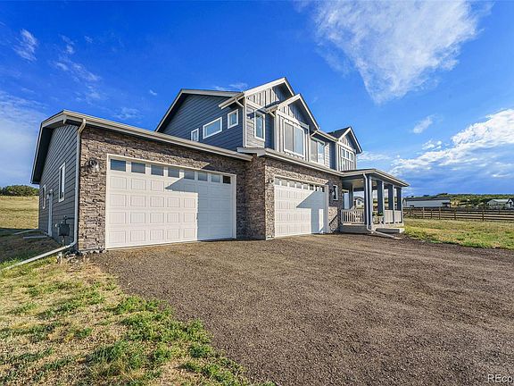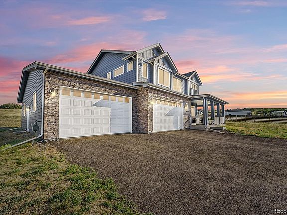 6 acre lot. 1G fiber Internet. Animals and farming are permitted. Additional expansions like guest house, barn, RV garage permitted. L2 EV charger. 10 minutes to Castle Rock outlet mall. Backs to Douglas County open space. 7-car drive-thru garage. Open to below with a 20ft ceiling. Spacious wraparound porch! Visit this gorgeous semi-custom contemporary farmhouse in the Cobblestone Ranch neighborhood! Wide plank wood flooring, custom metal railings, and soaring ceilings flow effortlessly throughout the house, highlighted by plenty of windows letting in abundant natural light. Custom kitchen complete with gray stained cabinetry, quartz counters, stainless appliances, and an oversized pantry. The open-concept floor plan allows traffic flow to move easily between the dining area and the adjoining living space while entertaining family and friends. Step outside to the wraparound porch and enjoy the breathtaking surroundings, including the abutting Douglas County open space where you can wander trails, listen to the wildlife and view the gorgeous sunsets. The property also provides room for future expansion by adding accessory units such as a guest home, RV garages, or barns with proper permitting - the options are endless for this homestead! Enjoy homestead living without sacrificing high-tech amenities including symmetric GIGABIT fiber optic internet and an EV charging station! Other note-worthy finishes and amenities include a seven-car tandem garage with the front garage featuring a 9’ door in addition to the rear door allowing you to pull through, a workshop area in the garage, a dedicated laundry room, and plenty of storage space! The exclusive Cobblestone Ranch neighborhood allows you privacy without sacrificing proximity to the city center, shopping, schools, and businesses all within ten minutes of your front door. Amazon and Doordash deliver to your front door.