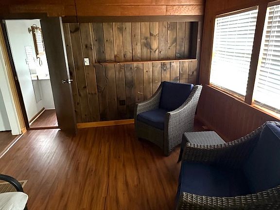 Front load washer-dryerOpen floor planDouble sinkTwin bunk bedsElectric oven-rangeNight standQueen-size bed