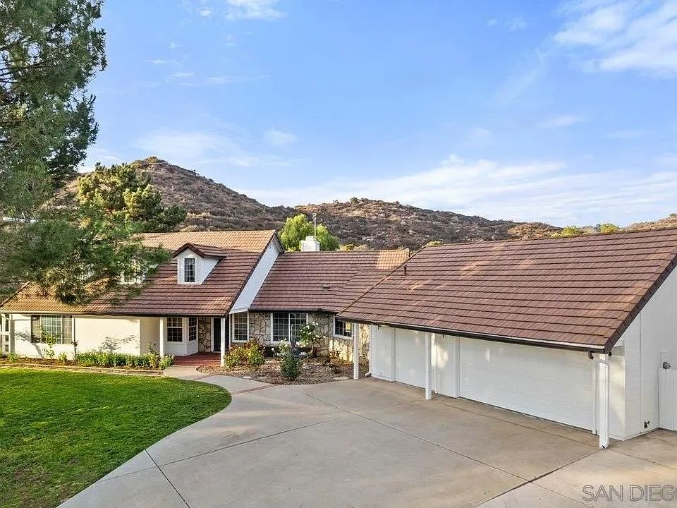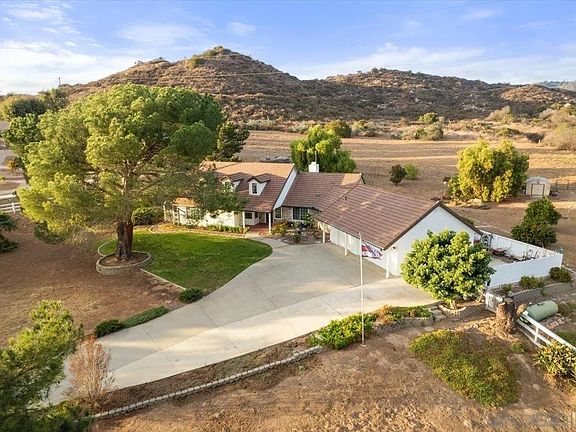 Welcome to this charming 4-bedroom, 2.5-bathroom single-story home located on a private road in scenic Fallbrook. With 2,290 sq. ft. of living space and situated on 2 acres of flat, usable land, this property offers breathtaking mountain views and endless possibilities. Inside, you’ll find a spacious kitchen and a cozy family room featuring a fireplace with built-in shelving. The primary bedroom is a serene retreat with a dual-sink vanity, soaking tub, and walk-in closet. Step outside to a large patio, perfect for entertaining, surrounded by producing fruit trees and open space. This property has room to grow, with potential for an ADU/guest house, horse corral, or more. Additional highlights include a 3-car garage with a workshop and a storage shed. Conveniently located just minutes from the Santa Margarita River Trail and Fallbrook Village’s shops and restaurants.