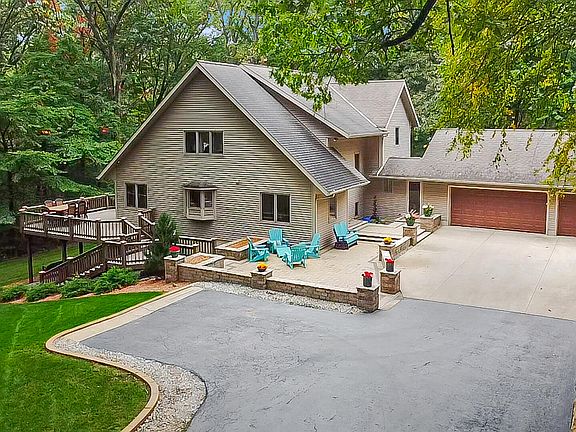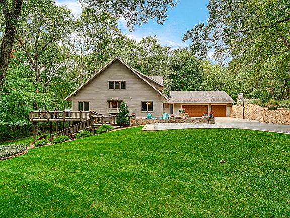 Escape to your own private sanctuary, perfectly secluded on over seven sprawling acres, complete with a campsite and trails.. You will immediately feel the stress of the day melt away as you journey up the long, tree-lined driveway, arriving at a private yard with impeccable landscaping, all nestled among mature trees. The impressive stonework on the exterior only hints at the quality within. Step inside through the large entry foyer and discover a main level designed for both comfort and grand living. The window-filled living room, crowned with tall ceilings, and the formal dining room are perfect for gatherings. The heart of the home, the kitchen, features the cutest breakfast nook where you can sit, sip your coffee, and gaze out at the beautiful view of trees and visiting wildlife. The main level also hosts the newly remodeled laundry room--a space so bright and functional, you'll actually want to do laundry in it. Retire to the huge primary suite, a true retreat complete with a private en suite bathroom. An architectural catwalk upstairs connects three more bedrooms, all of which are exceptionally large, along with a full bathroom. The "wow" factor continues in the finished basement, an entertainer's paradise featuring a 5th bedroom and a convenient second kitchen. Step outside to enjoy the expansive wrap-around deck, or relax in the private hot tub. Peace of mind is guaranteed with a whole-home Generac generator. For the hobbyist, entrepreneur, or collector, the property's crown jewel is the HUGE pole barn. This is not just storage; it's a fully operational second building featuring: full Climate Control (Heating & Air Conditioning), high-Speed Internet connection , a 2-Post Car Lift and massive ceilings high enough to store a full-size RV. With a three-car attached garage completing the package, this special listing, where pride of ownership shines through every detail, must be seen to be believed.