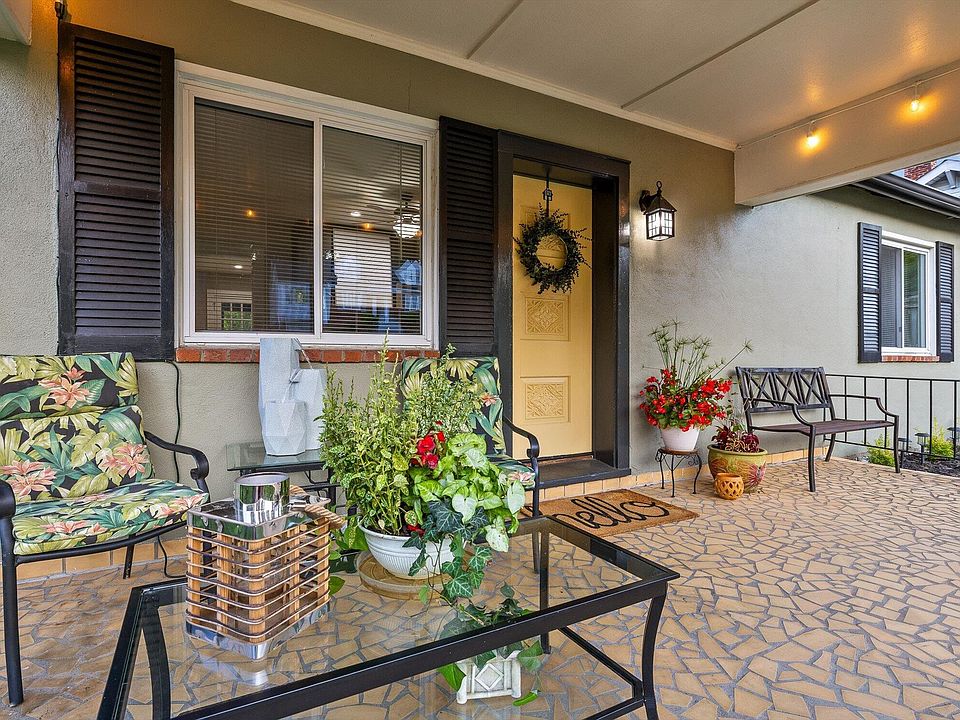 The charming 10x20 mosiac-tiled front porch offers an inviting space to gather.