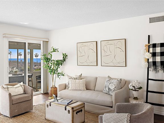 Perched in the sought-after Colony Cove community, 408 Camino San Clemente offers spacious single- level living with captivating Pacific Ocean views and refreshing coastal breezes throughout. This 55+ beach home blends comfortable coastal style with a relaxed, seaside lifestyle. The living area is bright and welcoming, featuring a cozy fireplace and slider doors that open to a covered porch, where sunsets over the ocean create a daily highlight. Both bedrooms showcase sweeping views, with the primary suite offering mirrored closet sliders and an attached bathroom. The galley-style kitchen includes crisp white cabinetry, Corian countertops, and tile flooring.