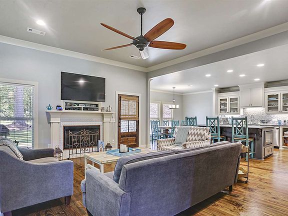 Set back upon a beautiful 4 acre lot, this home is absolute perfection! Complete with 4 bedrooms and 3.5 bathrooms, this spacious, open floor plan has it all. The inviting front porch welcomes you in, but stop and relax a while to enjoy the scenic views. You can't overlook the stunning, real pine flooring throughout, and the living room is spaciously centered around a fireplace. The kitchen was designed for a chef with its sub-zero refrigerator, Thermador range, oversized island with eat-up bar, custom tile work, granite countertops and more. A separate mudroom area includes custom built cubbies and desk for ideal organization and storage. The large master suite features tall, tray ceilings, double vanities, whirlpool tub, separate walk-in shower, water closet and double walk-in closets. All guest rooms are very generous in size with great storage. The laundry room includes granite countertops, a sink and cabinet storage galore. 3 car garage and separate storage for additional items or cars. Enjoy your summer evenings on this great back porch, which includes a custom wood ceiling and opens up to the most perfect view of the nature that surrounds you.
