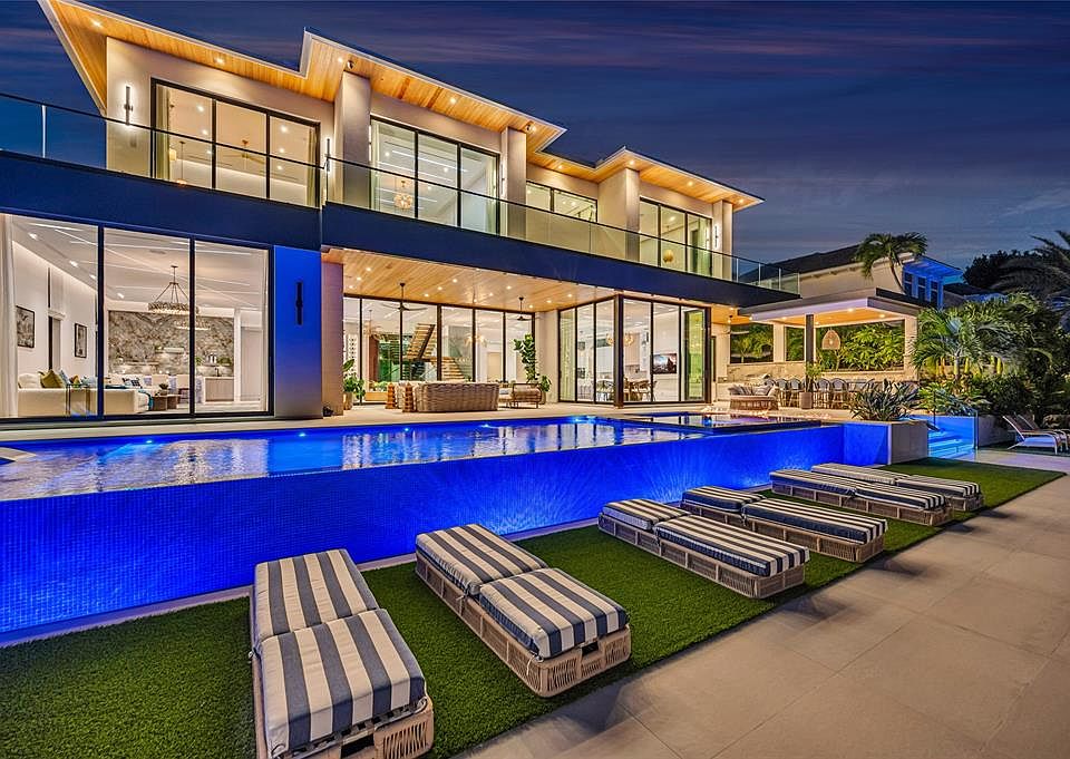A Statement of Modern Luxury, Tranquil, Bespoke, and Thoughtfully Designed for Family Living. New construction architectural triumph by Marcello Penso, worked with Gianni Versace NYC, this exceptional east-facing waterfront estate encompasses over 8,000 total sf with 100ft of waterfrontage and an impressive garage accommodating up to eight cars. Constructed with uncompromising precision using poured-in-place concrete, the residence showcases a stunning Cristallo Quartzite kitchen island, a floating fireplace, level-five knife-edge drywall ceilings, an illuminated wine display, and an elevator servicing all levels, including the garage. Soaring 36ft glass walls dissolve the boundaries between indoors and outdoors, opening to expansive terraces and a breathtaking 51ft infinity-edge pool. Designed for the discerning few who demand nothing less than perfection, this estate delivers resort-style amenities and designer interiors of exceptional sophistication, redefining modern waterfront living at every level.