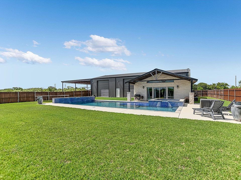 Welcome to your dream retreat in the desirable Backbone Valley! Situated on 3.5 Ag-exempt acres, this impressive barndominium offers the perfect blend of country charm and modern convenience — just a short drive to Marble Falls. This thoughtfully designed 3-bedroom, 3.5-bathroom home features an open-concept layout with a spacious eat-in kitchen that flows seamlessly into the cozy living room, complete with a wood-burning fireplace and custom built-ins. Each bedroom on the main level enjoys its own private full bathroom, offering comfort and privacy for all. The primary suite boasts vaulted ceilings, a long walk-in closet, and serene views of the pool area. Upstairs, you'll find a large game room and convenient half bath — perfect for entertaining or relaxing with family and friends. Step outside to your own private oasis: a HUGE heated in-ground pool and spa surrounded by a wooden privacy fence. The full property is enclosed with durable pipe fencing for peace of mind and added security. Connected through the laundry room is a show-stopping 45'x50' insulated metal shop featuring four full-length bay doors, a built-in bar top, and a dedicated half bathroom that also serves as a pool bath. It’s a mechanic’s dream and entertainer’s paradise all in one. The oversized lean-to is ideal for storing RVs, boats, and more. The exterior is a blend of durability and style, with a fully insulated metal structure wrapped in beautiful limestone for classic Hill Country appeal. Rural luxury and functionality in one!