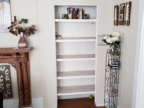 Original fireplace mantelOwn washer and dryerBuilt in shelves