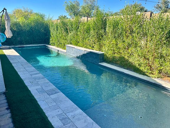 Modern pool with privacy hedges lining the entire property provides a private and peaceful retreat. Pool maintenance and landscaping handled by landlord. Black mesh removable pool fence included.