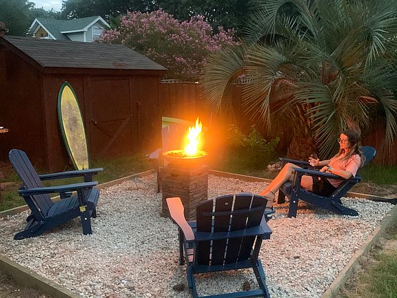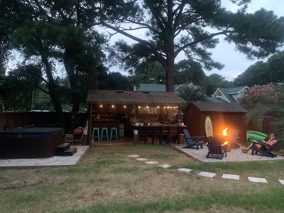 - Large fenced in backyard with hot tub, tiki bar with TV, and fire pit