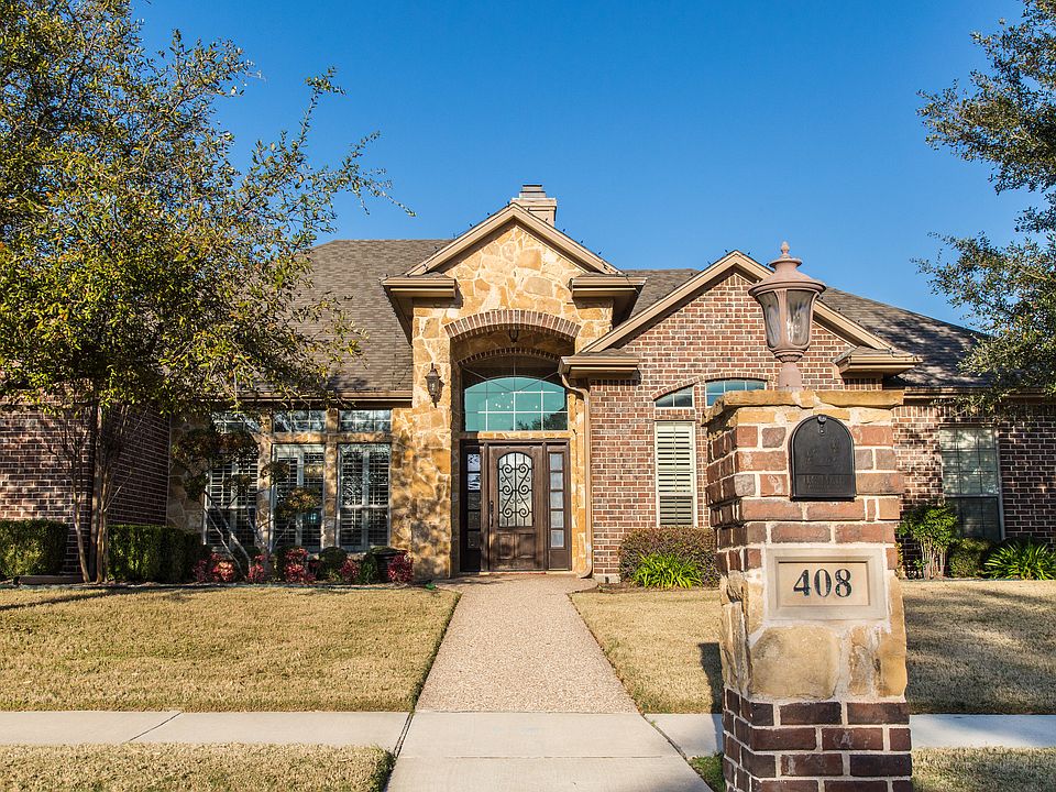 Custom home in convenient Hunters Run! 4 bed/3 baths with extra wide three-car garage! Features a spacious formal dining room, sunny open kitchen with stainless steel appliances, double ovens, and walk-in pantry. Living room has a wall of built-ins and a stone fireplace. Master bath features jetted tub, glass shower, and dual vanities. Vaulted or tray ceilings, plantation shutters, and crown molding are found throughout. Enjoy the cozy covered patio on this landscaped spacious corner lot.