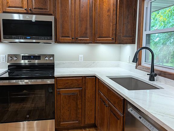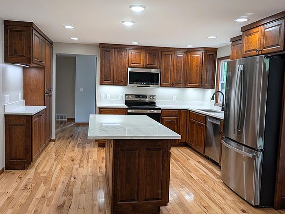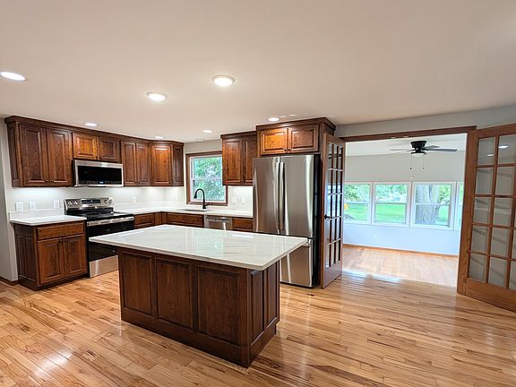 Welcome to this beautifully updated 4-bedroom, 2-bath home that perfectly blends modern style with functional living. Step inside to discover a custom-designed kitchen featuring stunning countertops, sleek cabinetry, and recessed lighting, perfect for both everyday living and entertaining. Gorgeous wood floors flow throughout the home, creating a warm and inviting atmosphere. The main level offers a spacious living room, while the finished basement provides an additional family room, ideal for movie nights, a play area, or a home office. Both bathrooms have been fully remodeled with stylish, modern finishes. Enjoy year-round comfort in the bright and airy four-seasons room located just off the kitchen, or head outside to the expansive deck that overlooks a large backyard complete with a storage shed and a charming swing set. A convenient 2-stall attached garage adds extra storage and functionality, making this home as practical as it is beautiful. This move-in-ready home is a rare find, offering space, style, and comfort in one complete package.