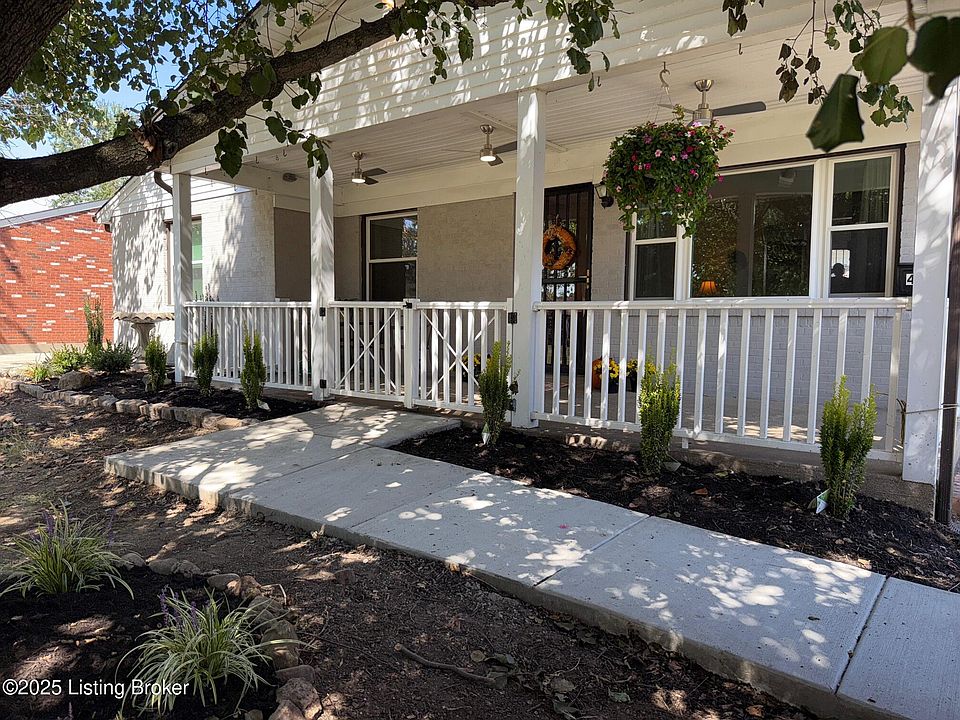 Wood burning fireplaceRecently painted exterior brickLots of cabinetsSpacious eat-in kitchenLarge covered front porchTile flooring
